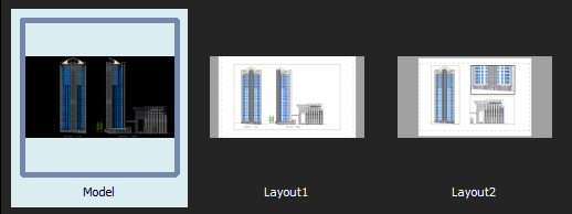 Preview panels with thumbnails for each workspace (model or layout sheet) of the open drawings appear as you hover over the tabs. Previews update when you save the drawing or switch between workspaces. If not all thumbnails fit to a preview panel, arrows at both ends of the panel scroll thumbnails to the right or left.