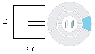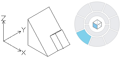 You can switch to one of the available predefined views by clicking one of the ring sectors. The views can be relative to the active CCS or WCS. The cube’s position changes to reflect the orientation of the model.